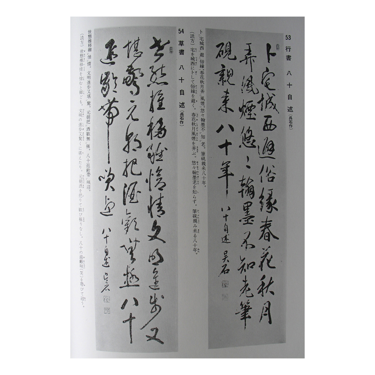西脇呉石先生の条幅、額、屏風や南画、書の変化に富んだ作品を、50歳~70歳までの作品から50点、80歳以後の作品から50点合計100点の名作を年代順にまとめたもので、手本として書に南画に利用できます。
